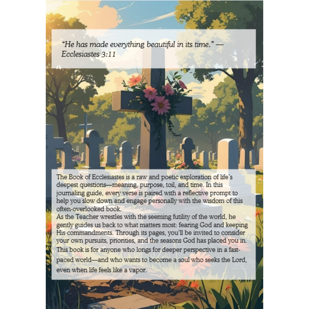 The Book of Ecclesiastes is a raw and poetic exploration of life’s deepest questions—meaning, purpose, toil, and time. In this journaling guide, every verse is paired with a reflective prompt to help you slow down and engage personally with the wisdom of this often-overlooked book. As the Teacher wrestles with the seeming futility of the world, he gently guides us back to what matters most: fearing God and keeping His commandments. Through its pages, you’ll be invited to consider your own pursuits, priorities, and the seasons God has placed you in. This book is for anyone who longs for deeper perspective in a fast-paced world—and who wants to become a soul who seeks the Lord, even when life feels like a vapor.